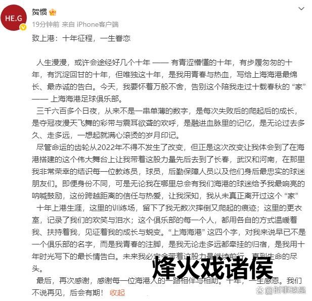 1 月 6 日,效能俱乐部长达 14 年的 32 岁中后卫贺惯 “自宣” 离队,他在外交媒体发布了《致上港:十四年征途,一世留恋》的告别信:只好这十四年,是我用芳华与热血,写给上海海港最绵长、最针织的广告。今天,我要怀着百般不舍,告别这个陪我走过十四载春秋的 “家”—— 上海海港足球俱乐部。