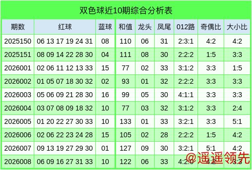当期红球号码大小比为3:3,012路比为4:2:0,奇偶比为4:2。龙头开出06,凤尾开出33,和值为122。
